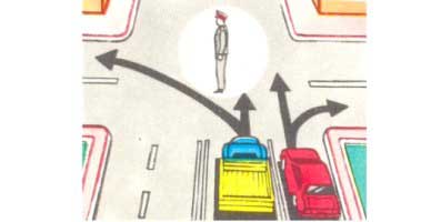 Կապտադեղին ավտոմոբիլին` ուղիղ, կարմիր ավտոմոբիլին` ուղիղ և դեպի աջ: